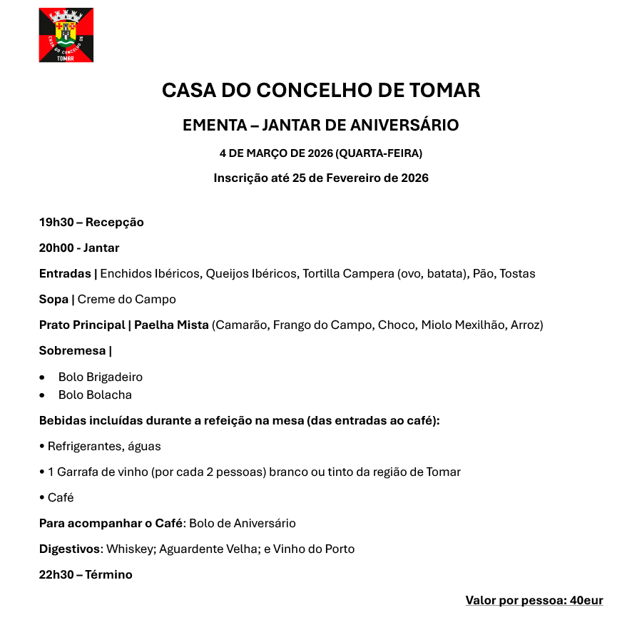 No próximo dia 4 de março, 4.ª feira, às 20h00, na sede da Casa do Concelho de Tomar teremos o Jantar Comemorativo do 83.º Aniversário.